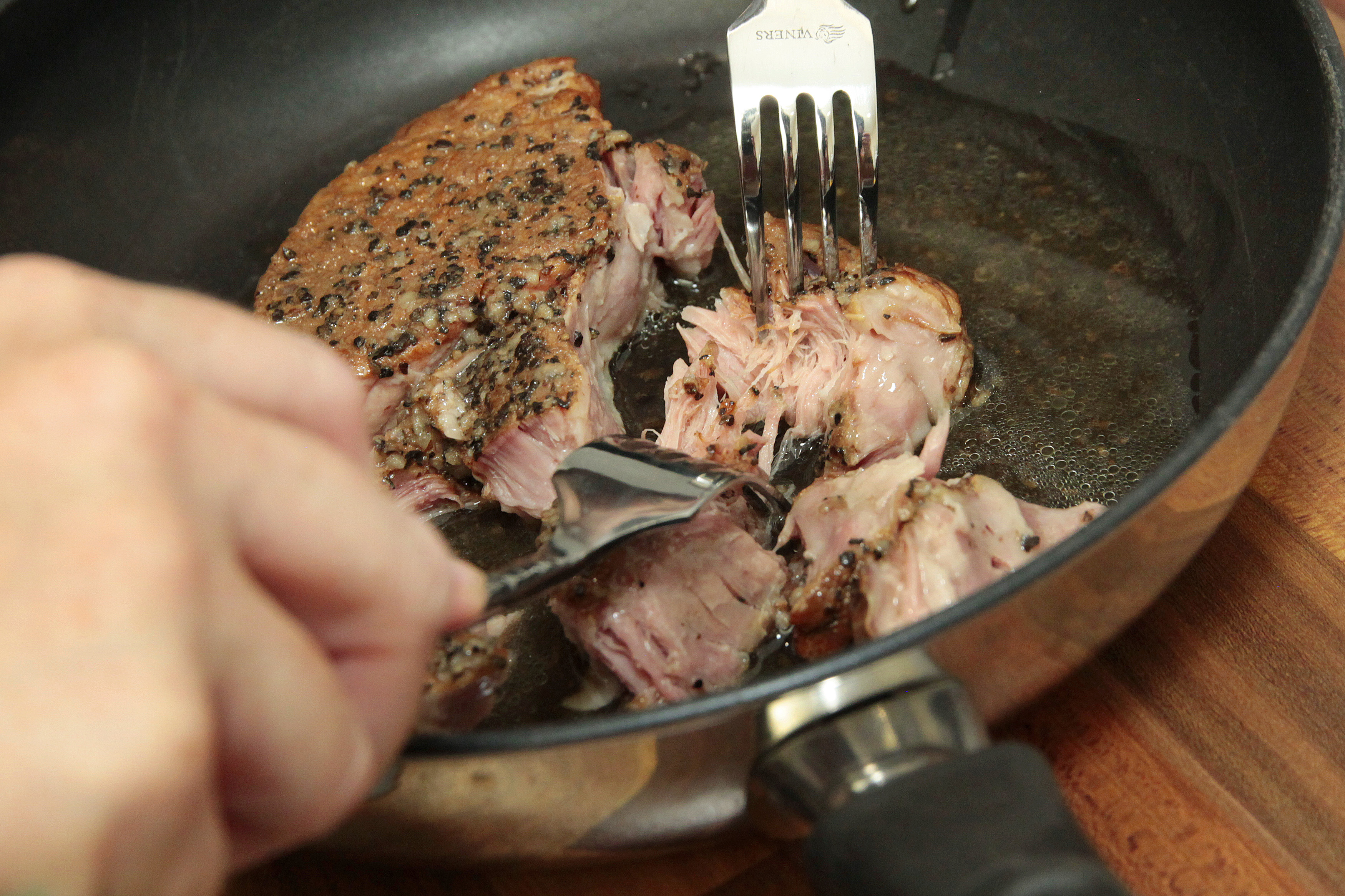 Remove the pack from the pan, open the bag and drain the liquid from the meat.