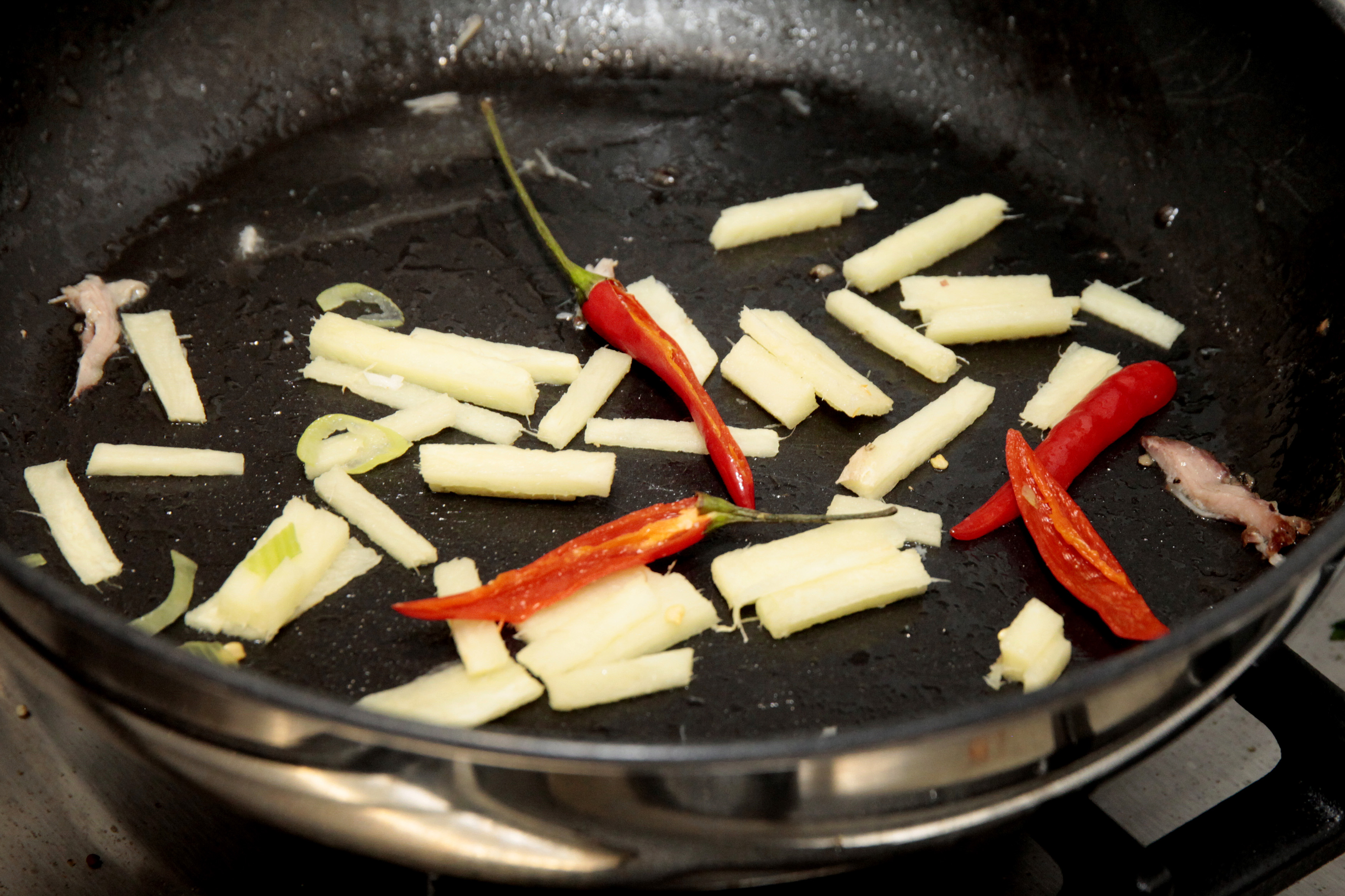To make an extra topping for the shredded pork, slice the chillies and ginger and fry gently in a little olive oil for a few minutes.