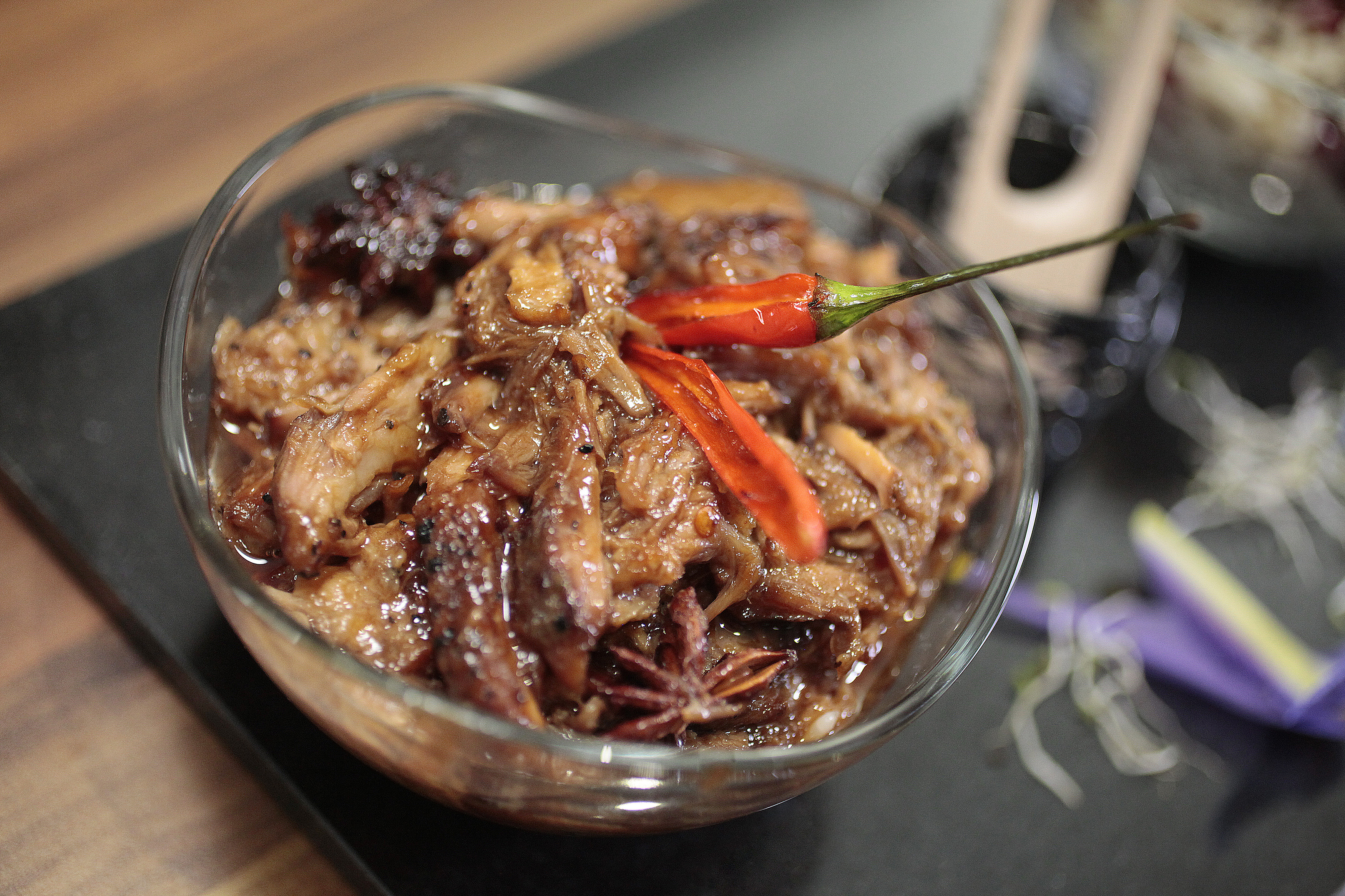 Spice pulled pork on a bed of basmati and wild rice jewelled with pomegranate and red apple with an Asian inspired jus.
