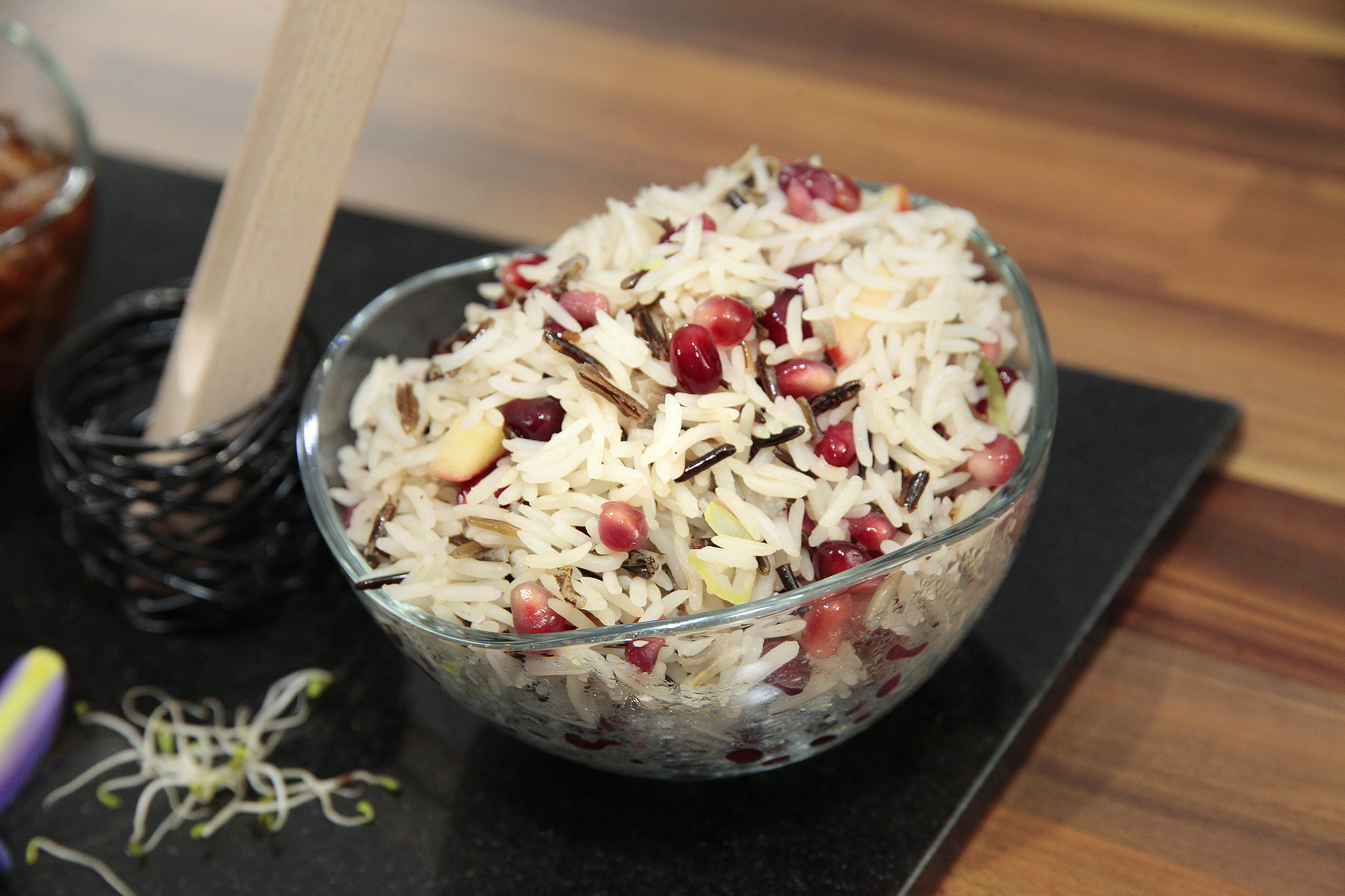 Add the pomegranate, chopped apple and sliced spring onions to the rice.